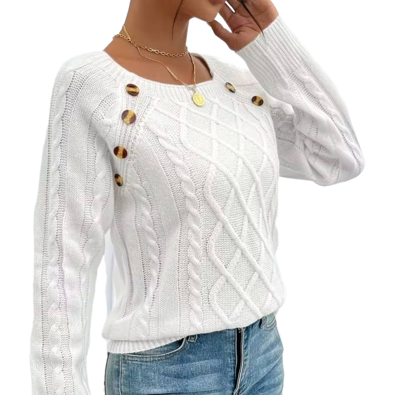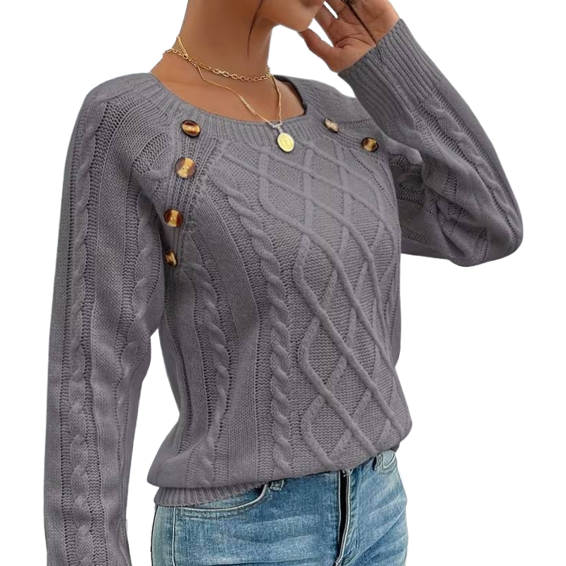 The Cozy Chic Cable Knit – Square Neck Lantern Sleeve Sweater (Rich Texture & Button Detail)